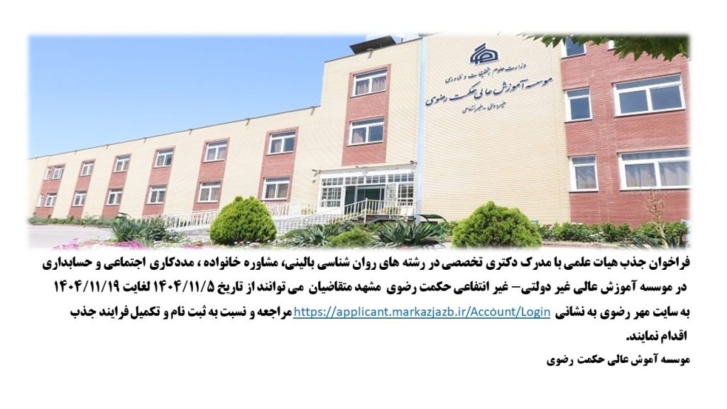 فراخوان جذب هیات علمی با مدرک دکتری تخصصی در رشته های روان شناسی بالینی، مشاوره خانواده ، مددکاری اجتماعی و حسابداری در موسسه آموزش عالی غیر دولتی- غیر انتفاعی حکمت رضوی مشهد متقاضیان می توانند از تاریخ 1404/11/5 لغایت 1404/11/19